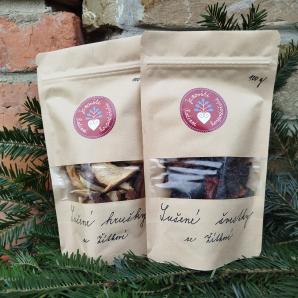 Švestky, jablka a hrušky v bio kvalitě sušíme tradičními postupy, ručně ve vlastní sušárně. Švestky jsou vypeckované, nesířené.