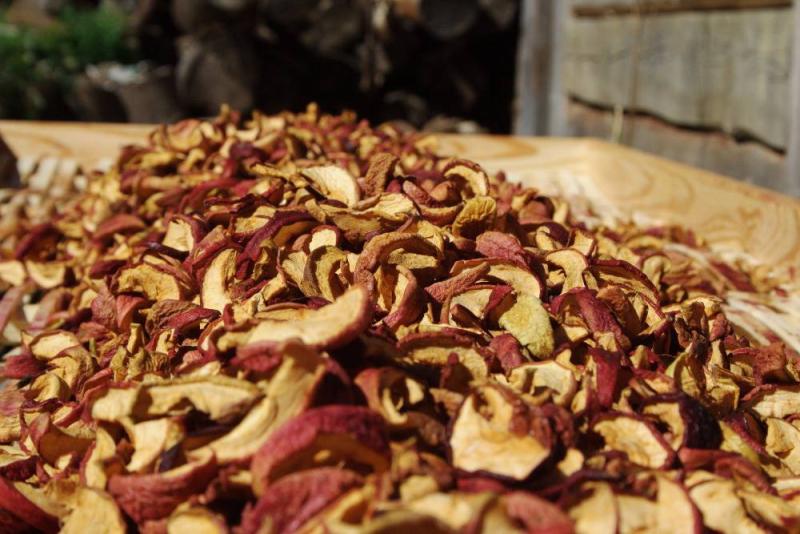 Ovoce suším v klasické dřevěné sušárně, kde teplo vzniká spalováním dřeva ze starých stromů ze sadu. Popel pak využívám v přilehlé zahradě.